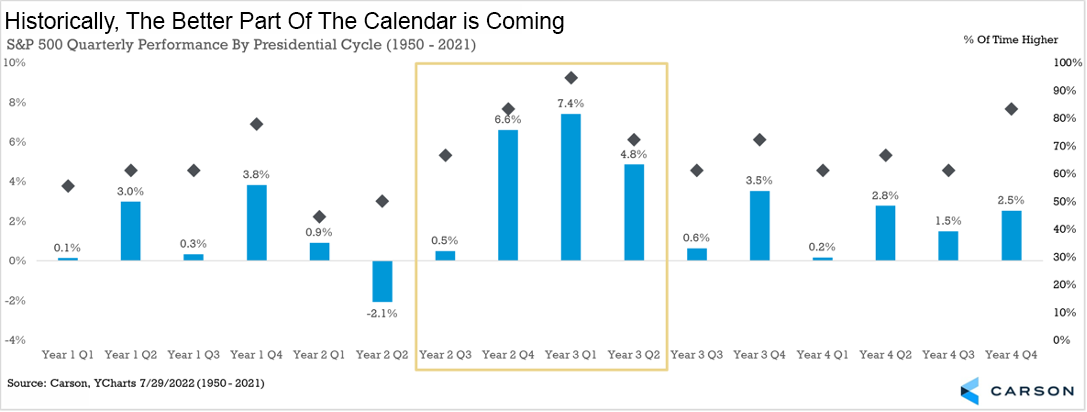 Third, here’s a chart we’ve shared a lot lately, but we’ll do it again, as it is very powerful. Midterm years tend to see weak stock returns in the first three quarters (check for 2022), but the fourth quarter of a midterm is historically the second-best quarter out of the full four-year Presidential cycle. Historical trends point to the best quarter and third best quarter being right around the corner early next year. As bad as things have been so far this year, the calendar is a major tailwind currently.
