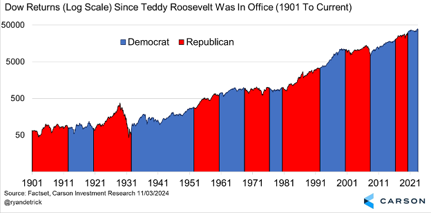 Here’s a chart that goes back to 1900 showing that stocks tend to go higher, regardless of who is in the White House.