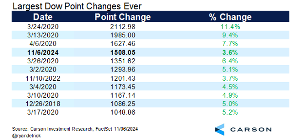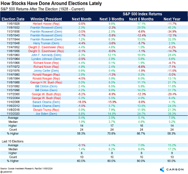 The S&P 500 soared 2.5% the day after the election, which was the best post-election day ever. Be aware though, it also jumped 2.2% when President Biden won in 2020. The last eight elections stocks moved at least 1% the day after the election, so post-election day volatility is normal.