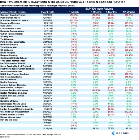 - Geopolitical worries are high, but historically the impact of global events on stocks has been short-lived, especially if the economy is strong.