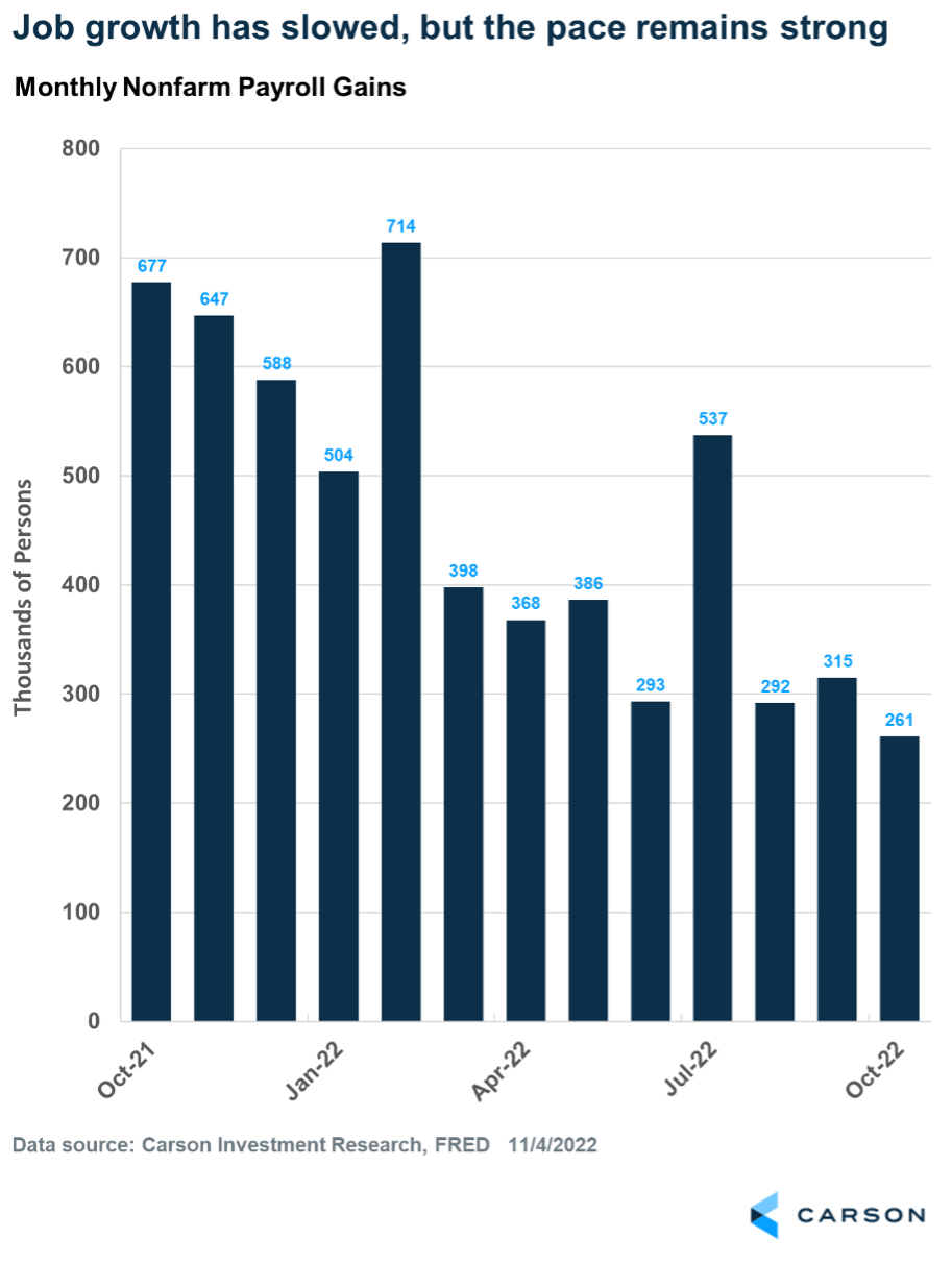 A more nuanced view is the employment situation is clearly slowing. But 261,000 jobs created in a month is still very strong. In fact, over the 20 years through 2019, a period that covered two economic expansions, the average monthly job gains in months when payrolls grew was about 182,000. And over the three years prior to the pandemic (Mar 2017-Feb 2020), payroll growth averaged about 186,000 per month.