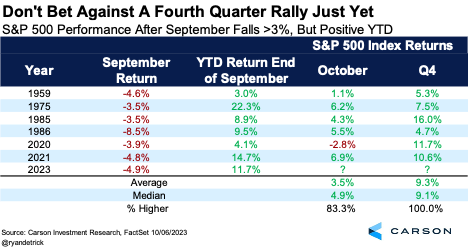 Stocks fell close to 5% in September, but this month hasn’t been good for stocks historically. So it was somewhat normal, even if it wasn’t fun. Encouragingly, years in which stocks fell at least 3% in September but remained higher year-to-date saw a nice bounce in October. The fourth quarter was also higher every time and up more than 9% on average. We believe a year-end rally is likely.