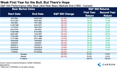 However, 1989 saw a gain of 29.0%, which was the best second year of a bull market ever. Additionally, out of 15 major bear market lows going back to 1950, the second year after the bear ended was higher every time, with an average gain of 13.5%.