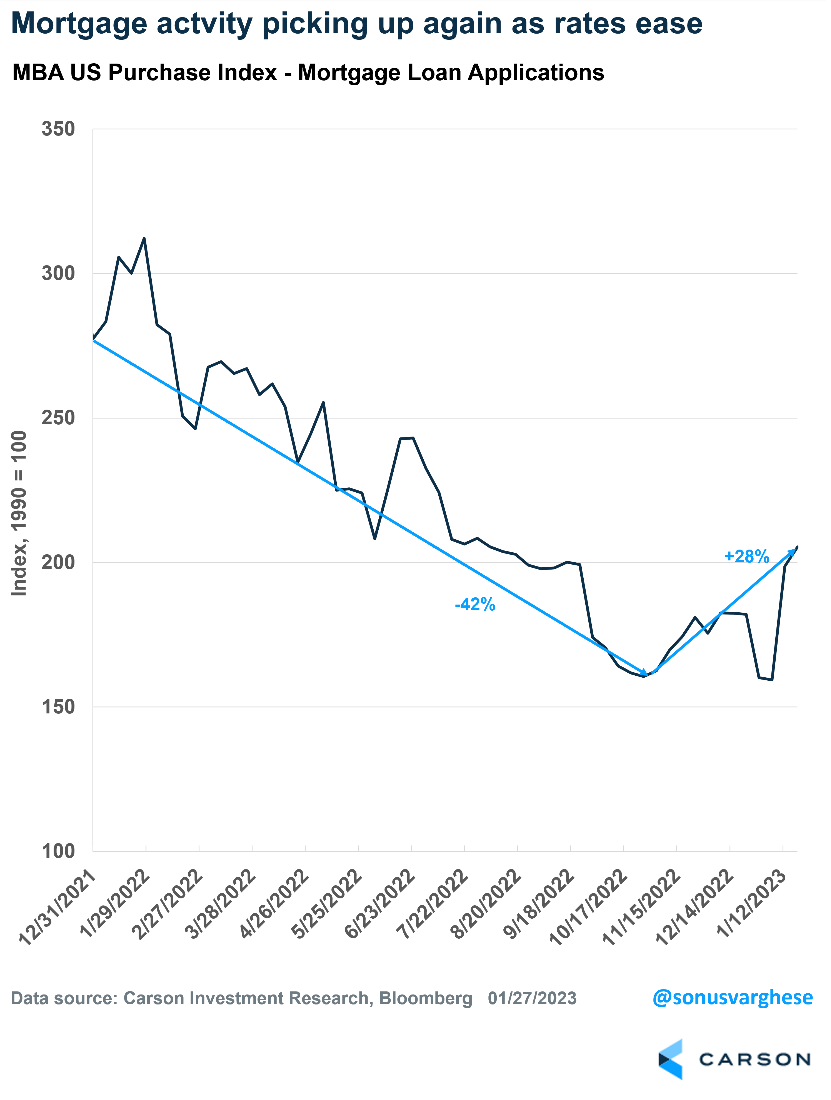 The good news is housing data appear less bad. In fact, mortgage activity has even picked up recently with rates pulling back from peak levels. So, there is sound reason to think housing will be less of a drag in 2023.