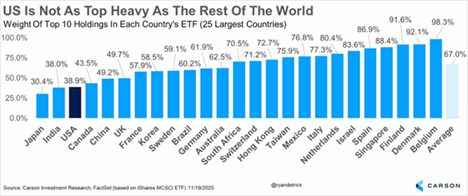 Yes, the top 10 stocks in the US account for nearly 40% of the overall market cap of the US. Here’s the thing: It was 39% last year at this time, and things have done just fine. But looking around the globe shows the US is actually one of the least top-heavy countries! In fact, only Japan and India are less top-heavy. We don’t have the same worry about this as others, but when you show it this way, it really hammers home that the US isn’t as top-heavy as it may seem.
