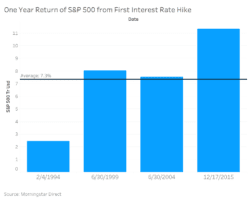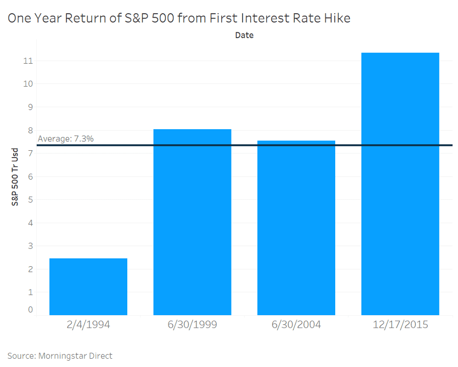 Last week we detailed how higher rates can pressure markets and are a risk worth watching. Yet, recent history shows rate hikes have reduced expected market returns but not turned them negative. In the last four interest-rate-hiking cycles, the S&P 500 averaged an increase of 7.3% in the 12 months following the initial rate hike. It was higher in all four cycles (Figure 2).