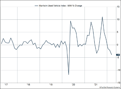 - Used vehicle prices, which rocketed higher during the pandemic, declined for the second consecutive month.