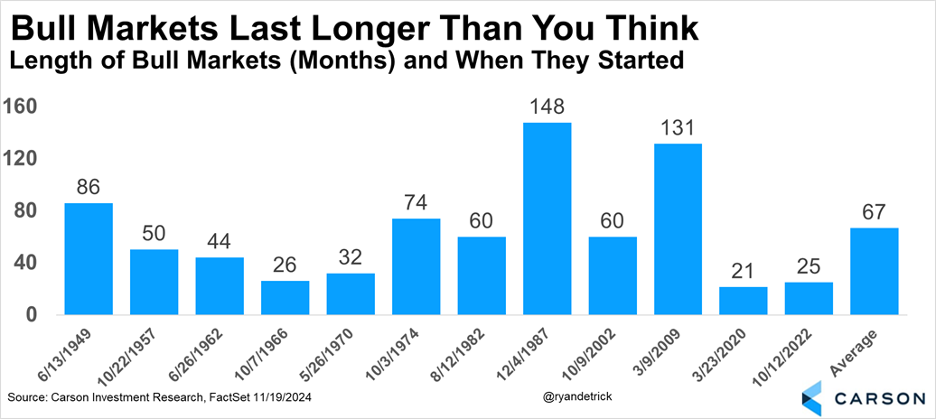 Looking at the previous 11 bull markets, we found the average bull lasted more than five years, suggesting even though this bull market is mighty, it could have plenty of time left. In fact, going back 50 years, once a bull market made it into its third year there were multiple years left every time.