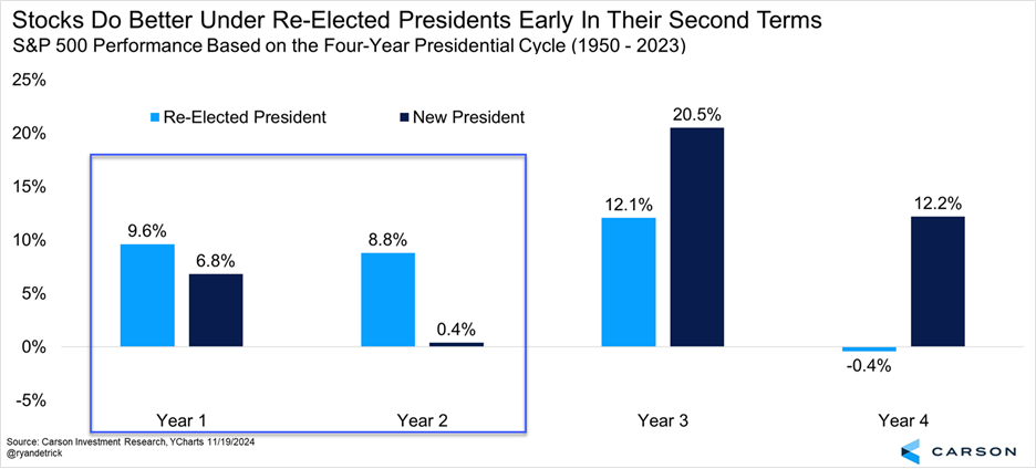 Did you hear we had an election recently? Yeah, you probably heard, but what you might not have heard was that the S&P 500 has done quite well in Year One and Year Two under a re-elected president (and better than under a new president). Feeling skeptical? Well, the four years under President Biden played out almost exactly according to script for a new president in office. Historically, year one does well (which we saw in 2021). Then year two is weak (think 2022 and the bear market). Finally, the final two years are strong (exactly what we saw in 2023 and 2024). No, we don’t say you should invest simply based on the presidential cycle, but we sure wouldn’t ignore it either.