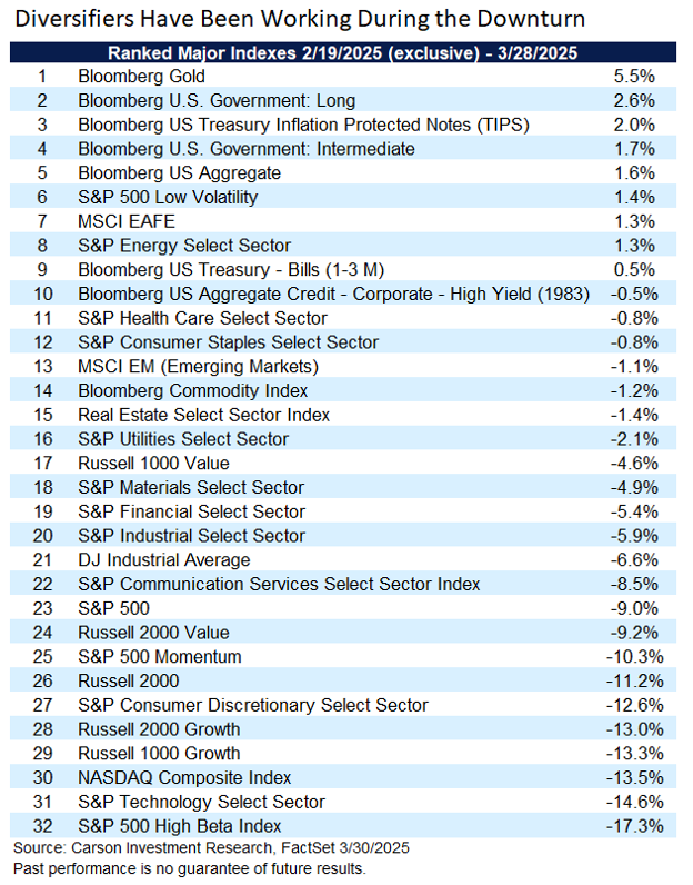 Below is a table of how some major indexes have done since the February 19 highs. Gold is positive, as are long and intermediate Treasuries as well as Treasury inflation-protected securities (TIPS). International developed stocks (the EAFE Index) have held up well, as have lower-volatility stocks. Don’t get us wrong—this hasn’t been an easy time for investors. But if you’ve had some diversification during this period it’s served you well so far.
