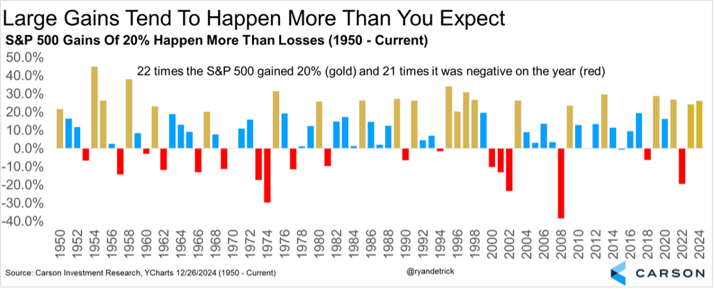 Another angle — after this year the S&P 500 will have gained more than 20% 22 times compared with an annual outright loss 21 times. In other words, the historical odds of a 20% gain are greater than a down year! Most investors aren’t prepared for this type of annual volatility, but it’ll help them if they indeed are.