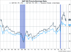 Earnings are likely to have grown more than 45% in 2021, based on the first three quarters of results and estimates for the fourth quarter. As shown in Figure 1, the strong earnings growth allowed the price-to-earnings (P/E) ratio to drop in 2021 even though markets moved significantly higher. While valuations have declined, they remain above average and are being supported by low bond rates. Figure 1 shows the next 12-month earnings (NTM) have fallen from a peak of 30 to just under 25. The last 12 months (LTM) P/E ratio has also declined.