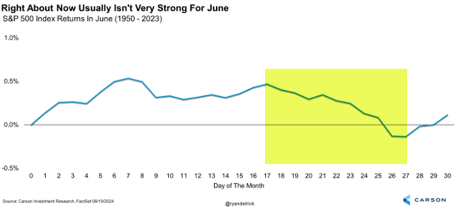 Now let’s be clear, stocks have been on a super strong rally lately. After gaining nearly 5% in May, stocks are up close to 4% in June so far. 1997 was the most recent year that saw gains of more than 4% in both of those usually tepid months, and stocks gained another 10% the rest of the year. But before we assume stocks will gain 4% in June, let’s be aware the month isn’t over yet and historically the latter part of June tends to be weak. After the run stocks have seen lately, some type of well-deserved break at some point before the end of the month would be perfectly normal.