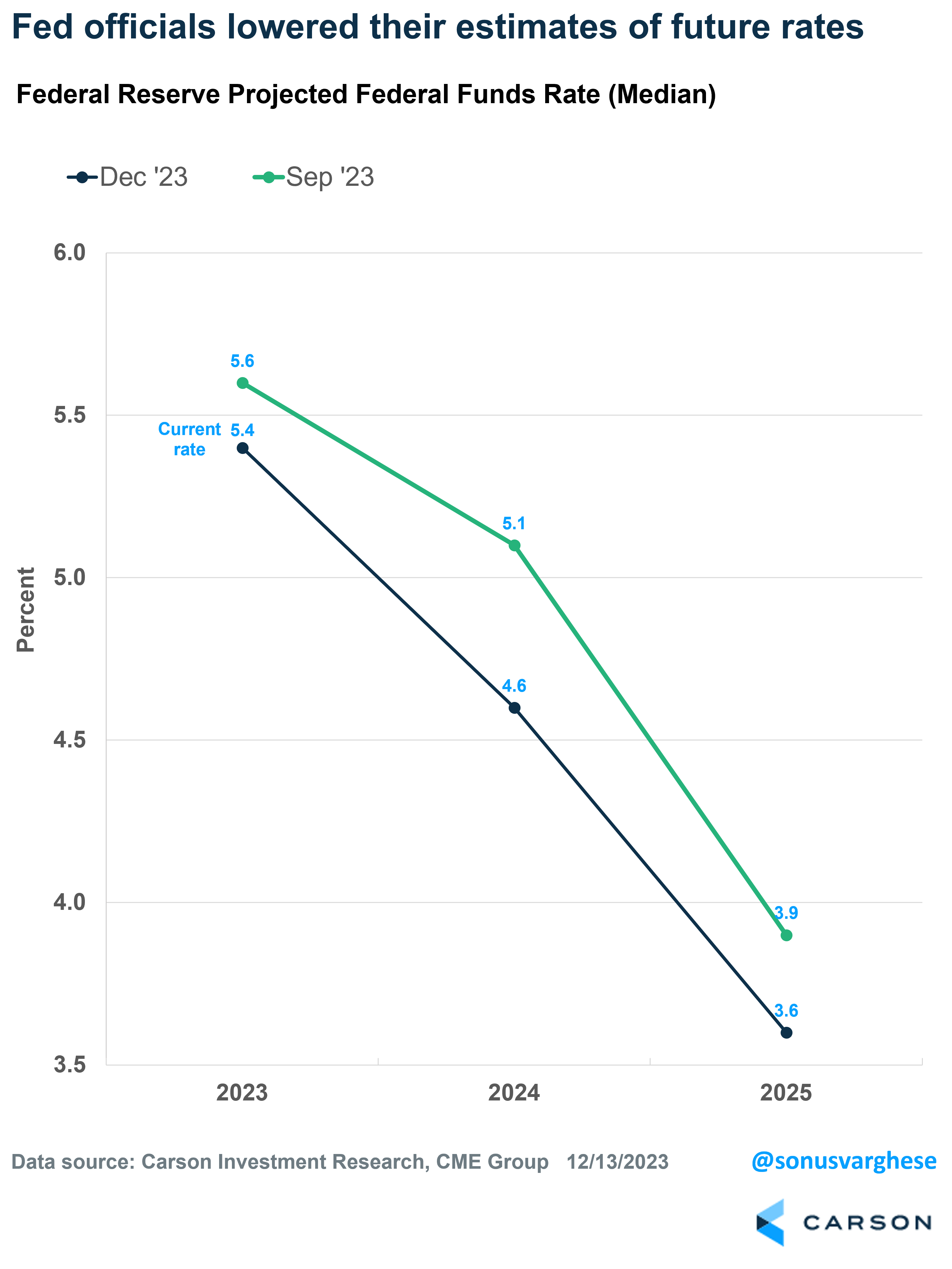 - They moved the 2024 rate estimate from 5.1% to 4.6%. The current rate is 5.4%, so the updated estimate implies the Fed will cut rates by around 0.8% (about three 0.25% cuts) in 2023.