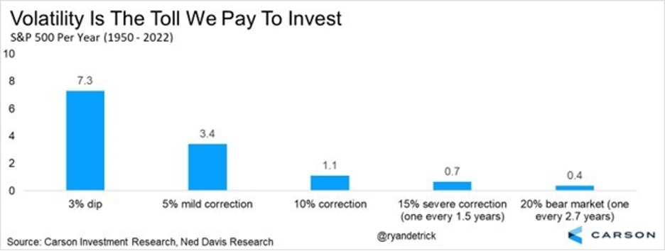 By no means do we want to suggest that stocks will go up in a straight line. We’ll continue to see volatility, with pullbacks and corrections along the way. As Ryan likes to say, volatility is the toll we pay to invest. Expect to see pullbacks, corrections, severe corrections, and perhaps even a bear market in which stocks fall 20%.