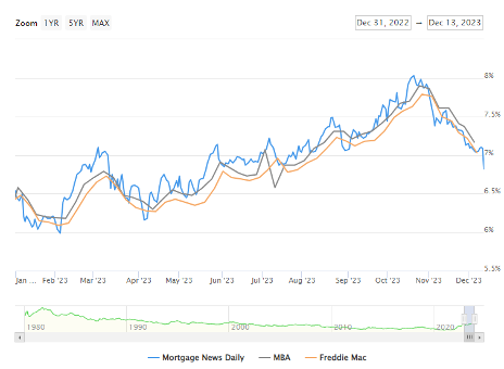Lower interest rates can have significant positive effects on the economy, including on mortgage rates. Thirty-year mortgage rates are now estimated to be close to 6.8%, down from around 8% in mid-October.
