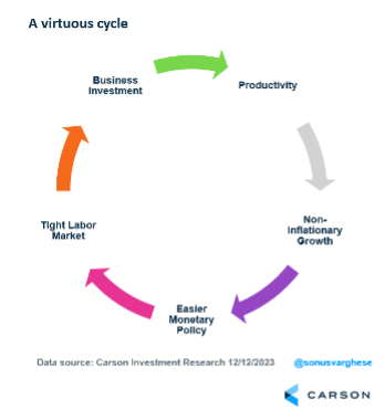 At Carson, we continue to believe the economy will avoid a recession. But we take a different view on the drivers of economic growth, emphasizing the upside of productivity growth. That view makes us optimistic on the expansion continuing in 2024 and even beyond. There’s been a lot of buzz around generative artificial intelligence (AI) this year. Our view is the watershed moment for this technology is not about what it can do for us now, but rather the environment that allows generative AI and other transformative innovations to flourish. Creating a supportive environment for technology such as AI involves a reshoring shift to the U.S., which is boosting domestic investment. That is why we believe America will outperform its developed market peers.
