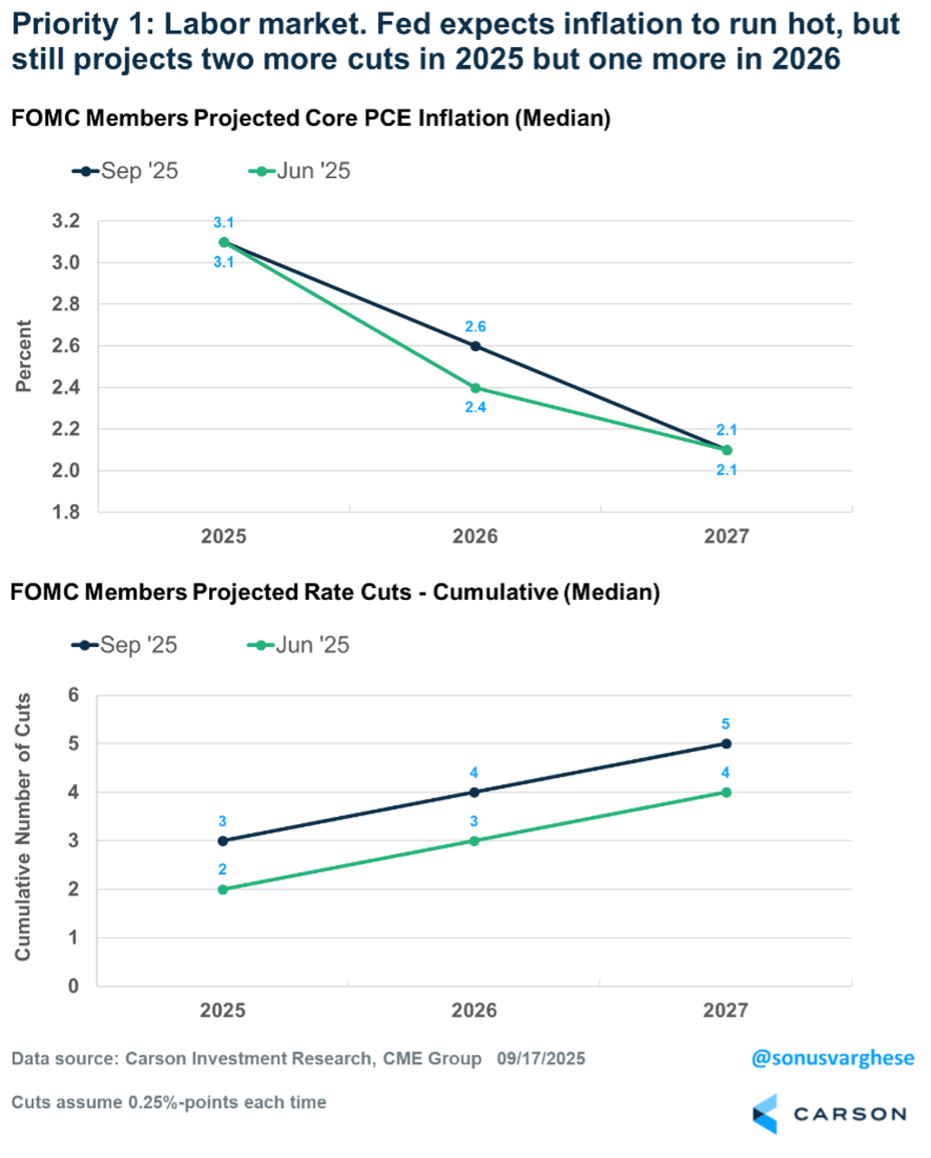 The Fed also updated their quarterly projections of future GDP growth, inflation, the unemployment rate, and their expectations for the policy rate (the “dot plot”). For 2025, the median Fed member projected two more cuts (0.25%-points each), which would take the policy rate to the 3.5–3.75% range. Relative to their June economic projections: