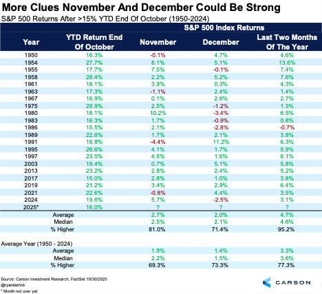 • In fact, when the S&P 500 is up at least 15% at the end of October, the final two months of the year have tended to be even stronger than average.