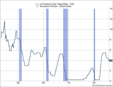 chart depicting US-Federal-Funds-Target-Rate-Yield-Vs-Recession-Periods